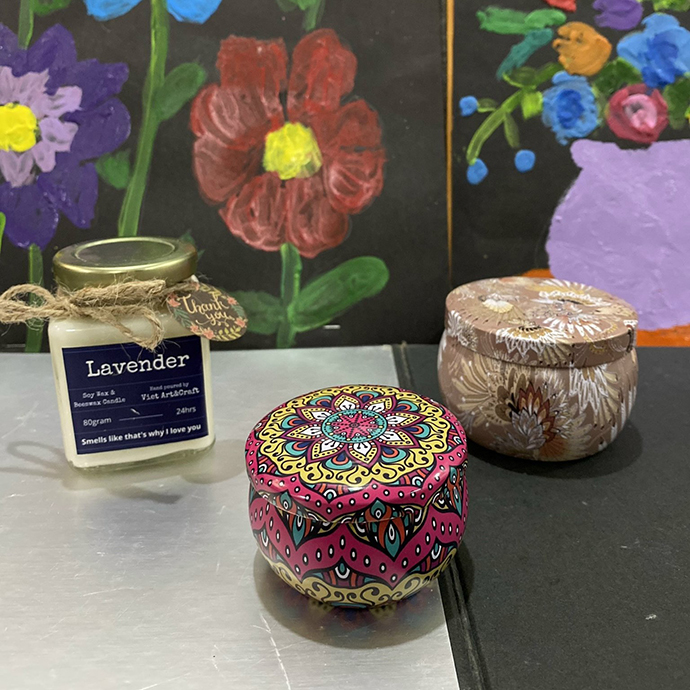 Nến được đổ thủ công với hộp đựng trang trí hoa văn tinh xảo, phù hợp nhiều phong cách quà tặng từ tối giản đến cao cấp.