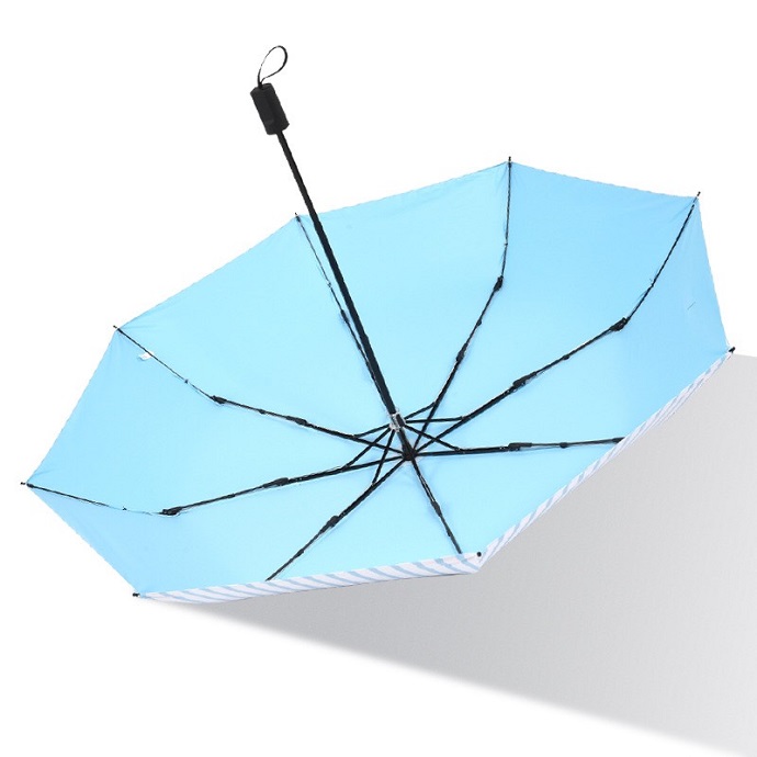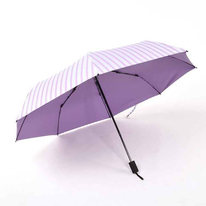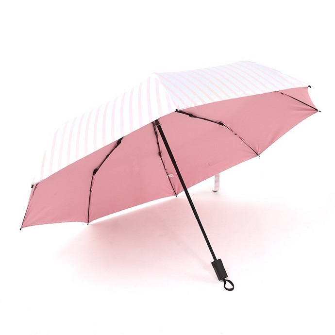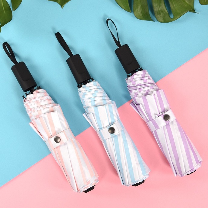 Ô dù gấp ngắn kẻ sọc pastel 3 màu (xanh – hồng – tím), thiết kế thời trang, nhỏ gọn và bền chắc. Vải dù chống thấm, tay cầm tiện dụng. Thích hợp in logo doanh nghiệp, làm quà tặng quảng cáo.