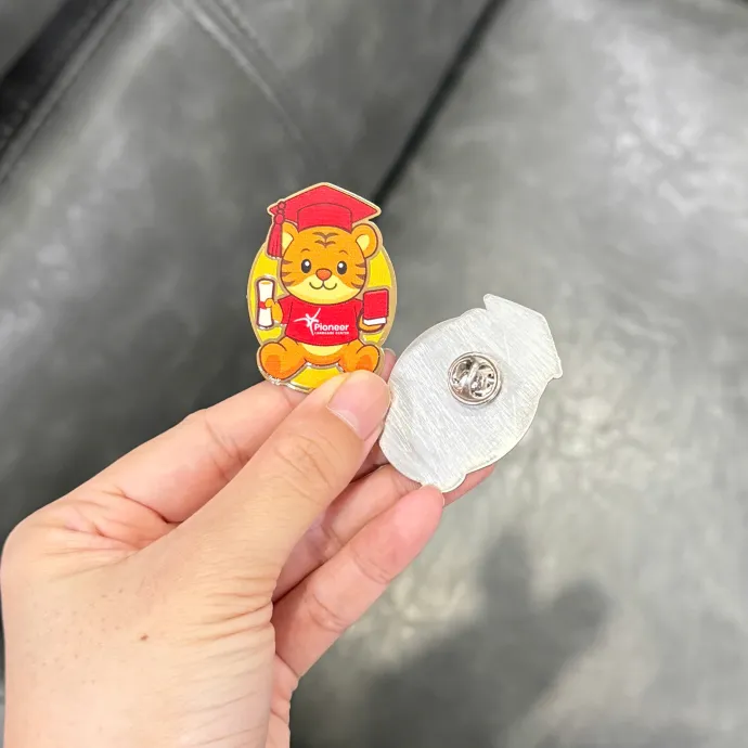 Pin kim loại hình hổ mặc trang phục tốt nghiệp — món quà nhỏ nhưng đầy ý nghĩa, thiết kế tinh xảo, màu sắc tươi sáng và đường nét sắc sảo. Sản phẩm phù hợp làm huy hiệu lưu niệm cho học sinh, sinh viên hoặc quà tặng tri ân trong sự kiện.