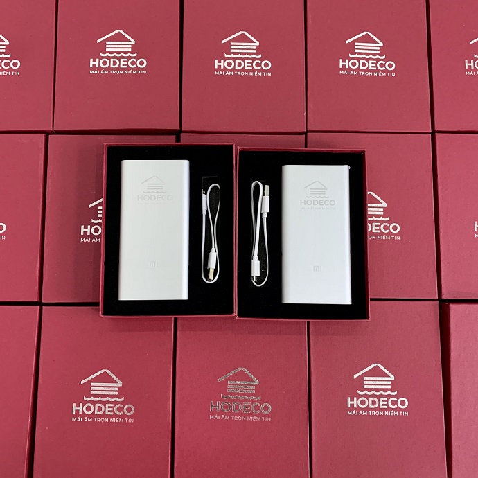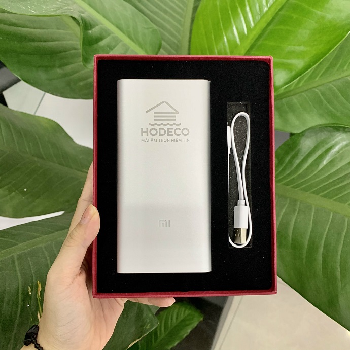 Pin sạc dự phòng màu bạc kèm hộp đựng cao cấp in logo hodeco.