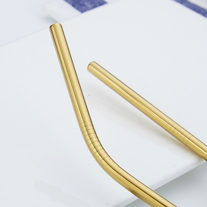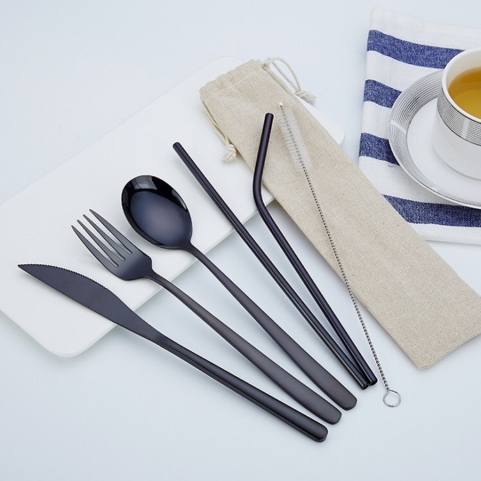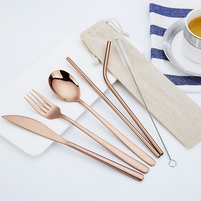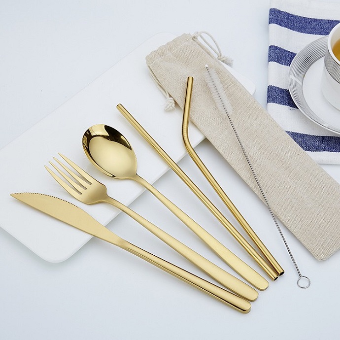 Bộ dụng cụ bàn ăn inox mạ vàng sang trọng gồm dao, nĩa, muỗng, ống hút thẳng – cong và cọ vệ sinh, kèm túi vải đựng tiện lợi. Phù hợp làm quà tặng doanh nghiệp, nhà hàng – khách sạn hoặc sử dụng cá nhân.