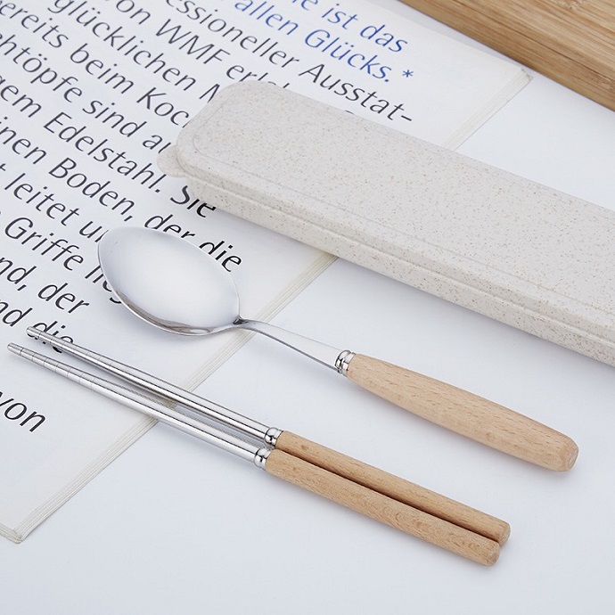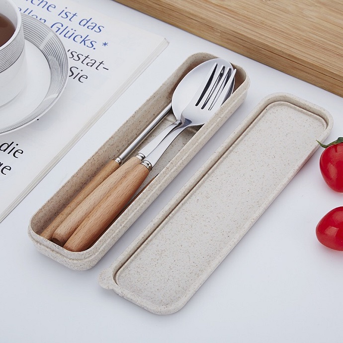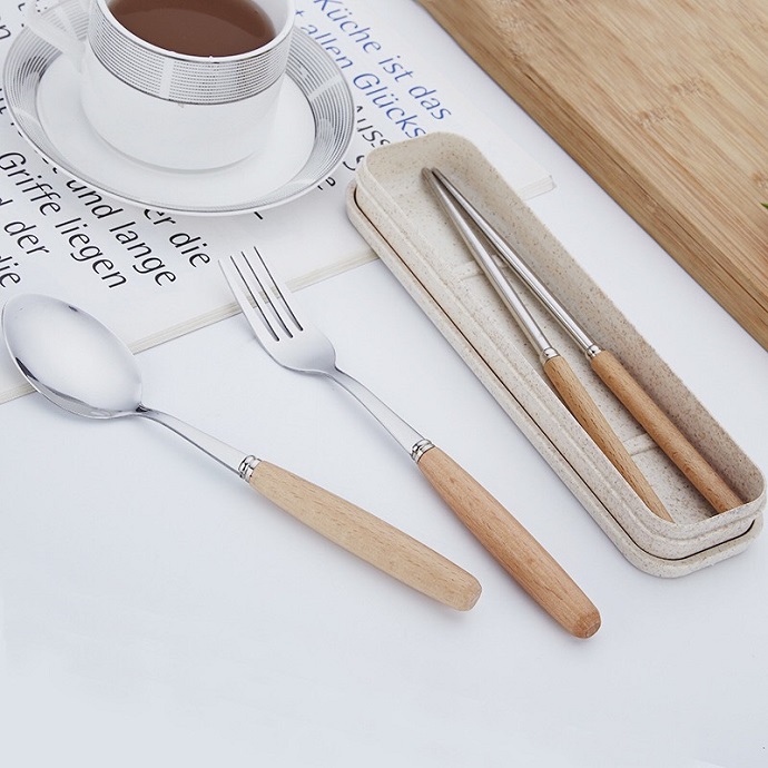 Bộ dụng cụ ăn uống cá nhân với chất liệu inox kết hợp cán gỗ chắc chắn, mang lại cảm giác cầm nắm thoải mái. Hộp đựng gọn gàng giúp bạn dễ dàng mang theo mỗi ngày mà không lo bẩn.