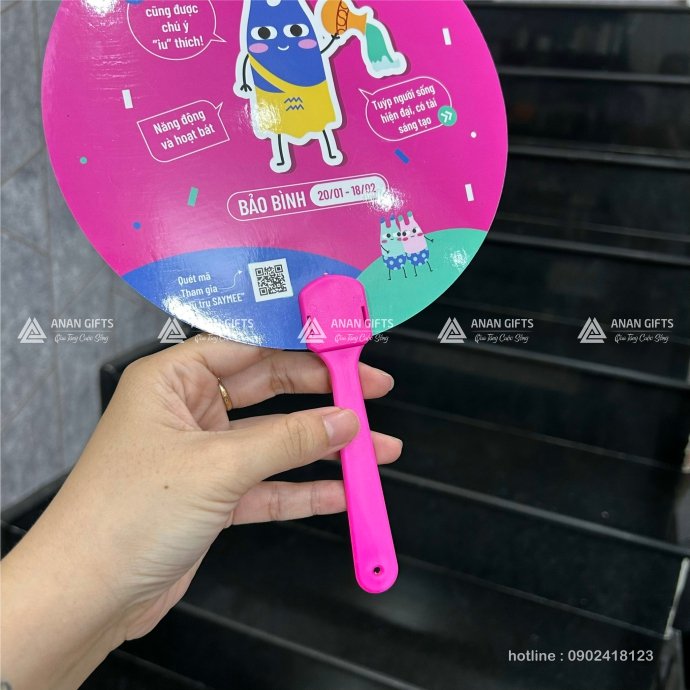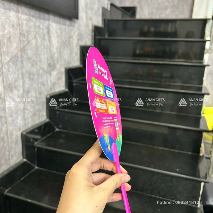 Kiểu dáng: quạt nhựa cầm tay in logo hình tròn, cán dạng to và thon, nhỏ gọn.