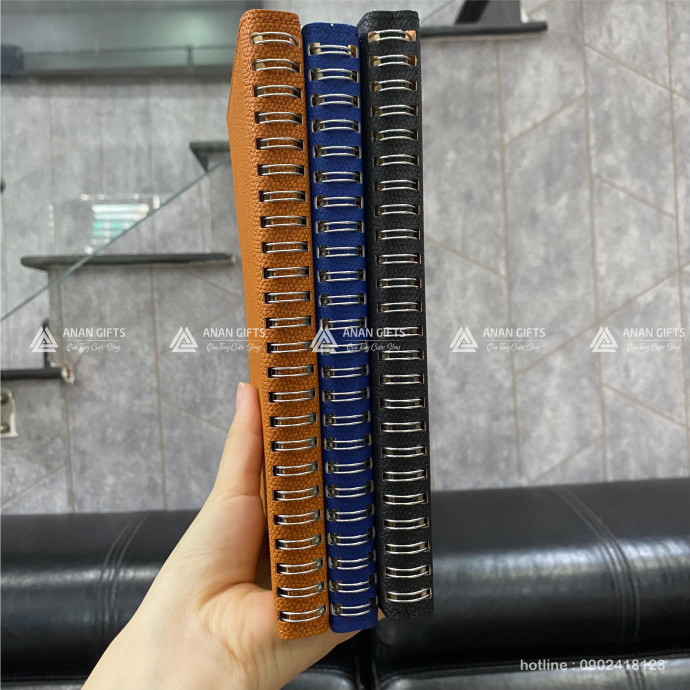 - Thành phẩm: sổ lò xo bìa da, đóng gói bao kiếng từng cuốn sổ.