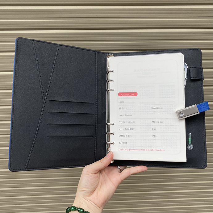 - Bìa sổ được làm từ da PU với thiết kế tinh tế, sang trọng. Bìa trước có các khe đựng tài liệu và namecard.