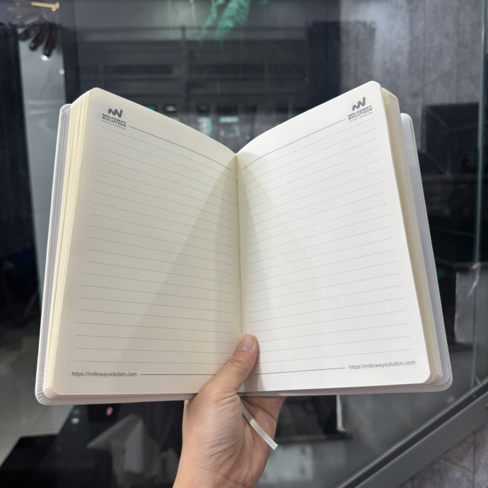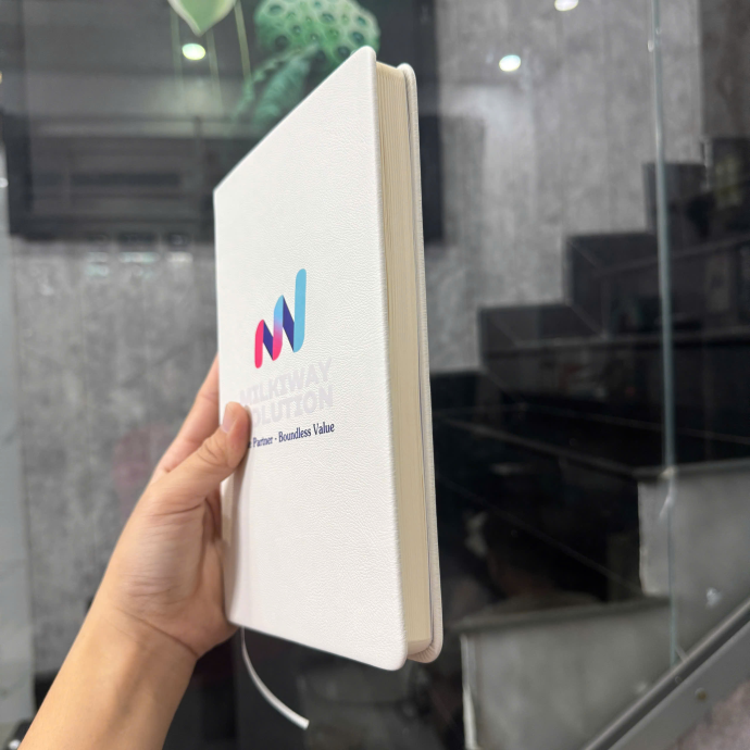 Sổ tay bìa da màu trắng cao cấp, thiết kế bìa cứng sang trọng, chất liệu giấy dày mịn, in logo theo yêu cầu, phù hợp làm quà tặng doanh nghiệp, sự kiện, đồng phục văn phòng.
