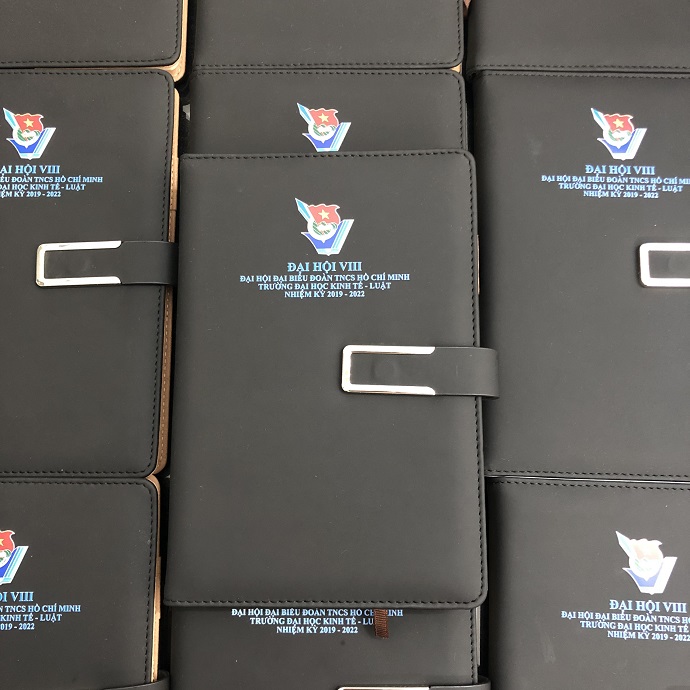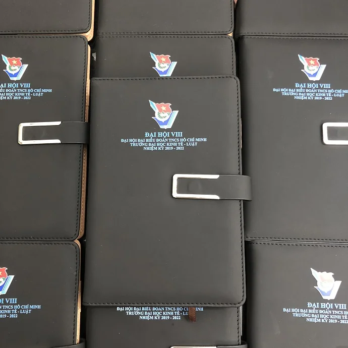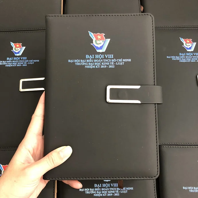 Sổ tay bìa da màu đen thiết kế khóa kim loại sang trọng, ruột giấy dày mịn – phù hợp làm quà tặng sự kiện, hội nghị và văn phòng.