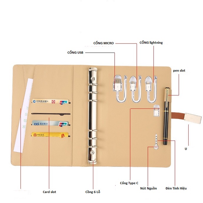 Bên trong sổ có sẵn cáp sạc đa cổng giúp hỗ trợ nhiều thiết bị khác nhau.