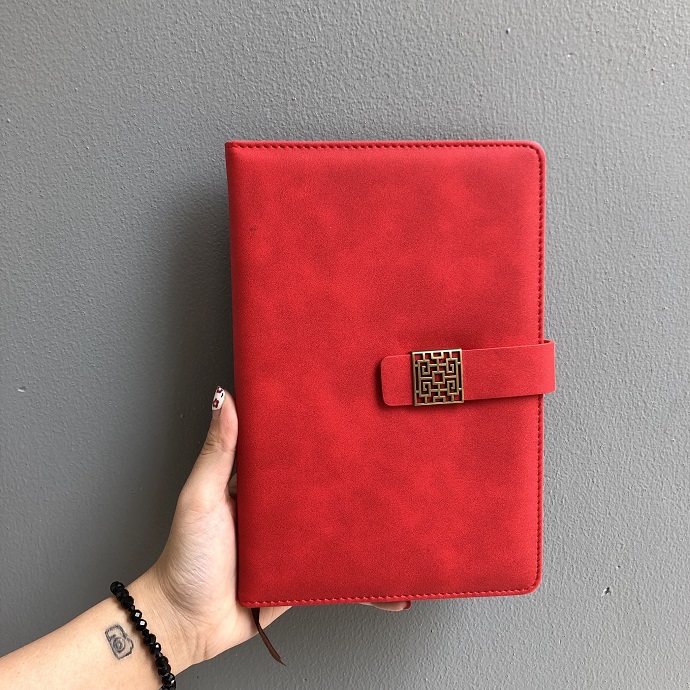 Sổ tay bìa da đỏ nổi bật với khóa kim loại hoa văn thanh lịch, mang phong cách hiện đại, phù hợp sử dụng trong công việc và đời sống hằng ngày.