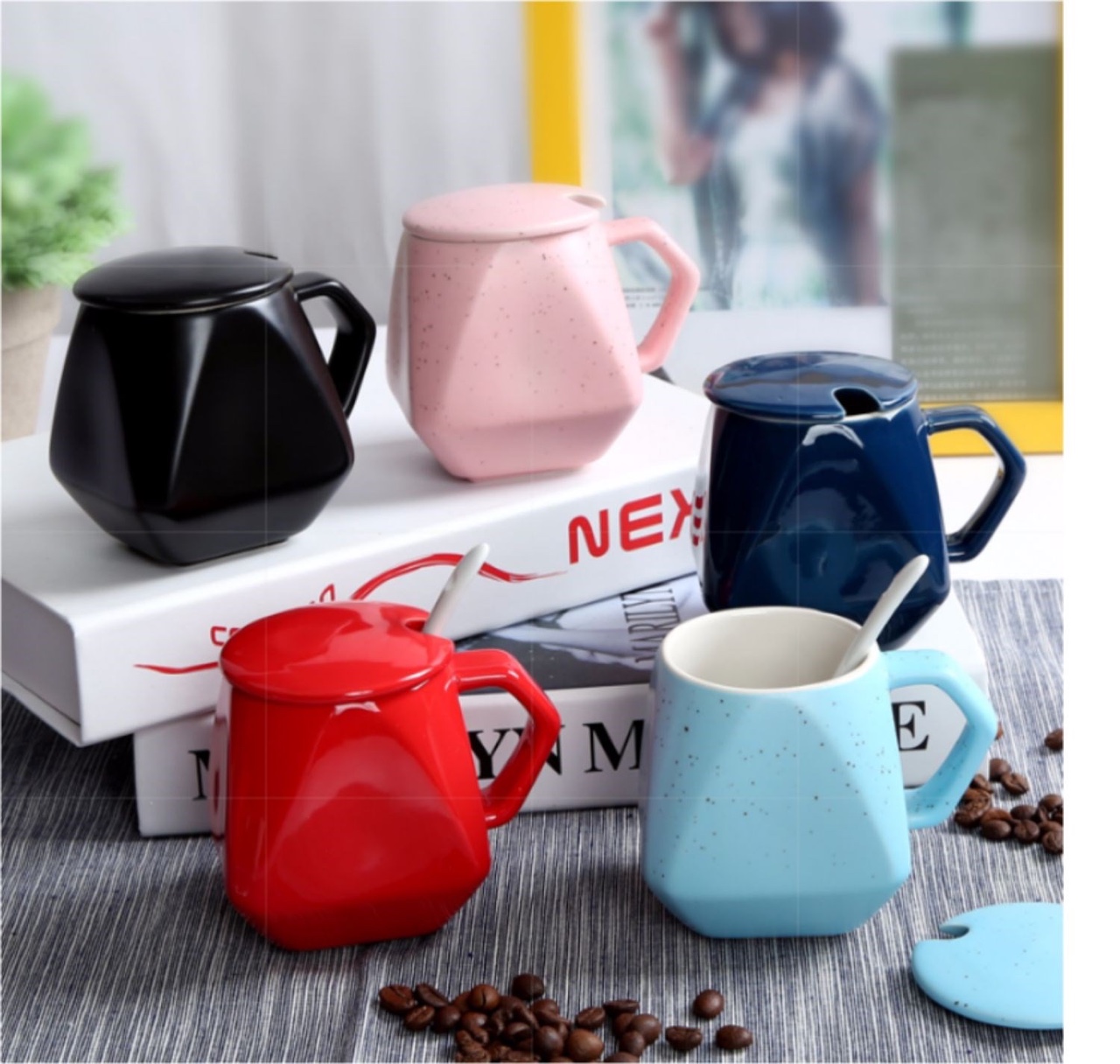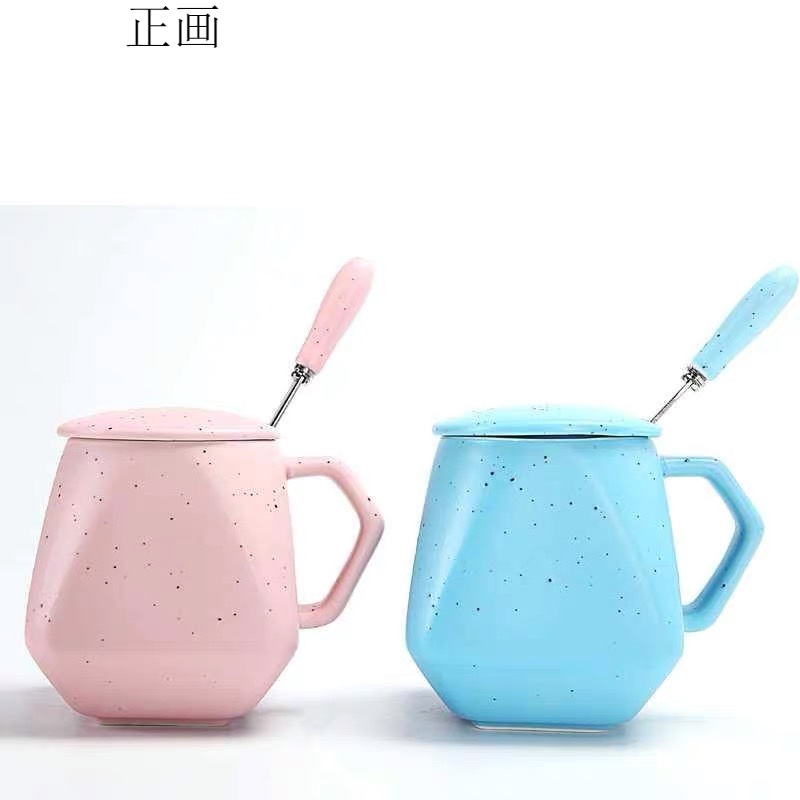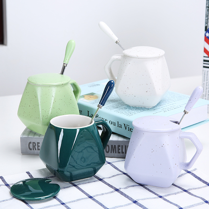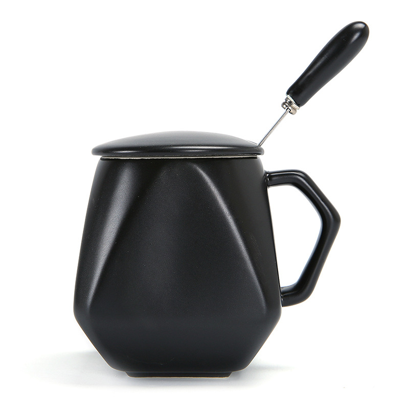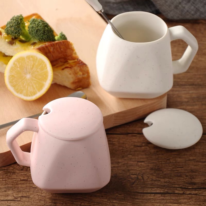 Ly sứ tráng men dung tích 280ml, thiết kế đa giác hiện đại, đi kèm nắp và muỗng đồng bộ, phù hợp làm quà tặng doanh nghiệp, quà sự kiện hoặc sử dụng hằng ngày.