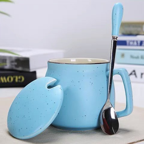 Ly sứ tráng men dung tích 280ml, thiết kế bo tròn hiện đại, bề mặt men chấm nhẹ tinh tế, đi kèm nắp và muỗng đồng bộ. Sản phẩm phù hợp làm quà tặng doanh nghiệp, quà sự kiện hoặc sử dụng hằng ngày.