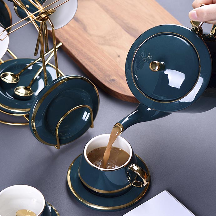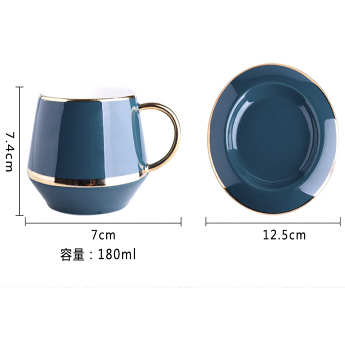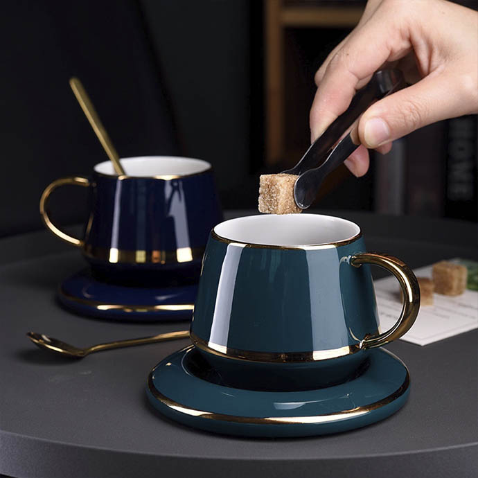 Ly sứ có độ dày vừa phải giúp giữ nhiệt tốt cho cà phê, trà nóng. Dĩa lót đồng màu tạo sự hài hòa tổng thể, thìa kim loại mạ vàng tăng tính thẩm mỹ và tiện lợi khi sử dụng.