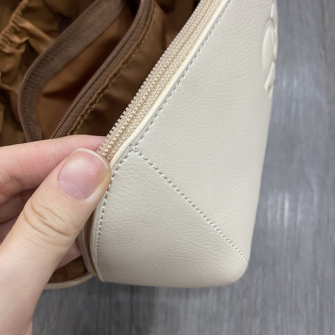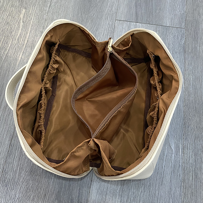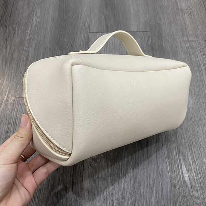 Sản phẩm túi đựng mỹ phẩm da PU màu kem được thiết kế sang trọng, nhỏ gọn với khóa kéo kim loại chắc chắn và quai xách tiện lợi. Logo thương hiệu dập chìm tinh tế trên bề mặt, giúp nâng tầm hình ảnh doanh nghiệp khi sử dụng làm quà tặng.