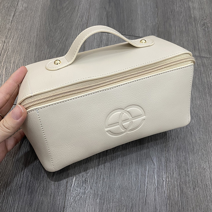 Túi đựng mỹ phẩm da PU cao cấp màu kem, thiết kế hình hộp sang trọng, có quai xách tiện dụng. Logo thương hiệu dập nổi tinh tế, phù hợp làm quà tặng sự kiện, quà doanh nghiệp hoặc sử dụng cá nhân.