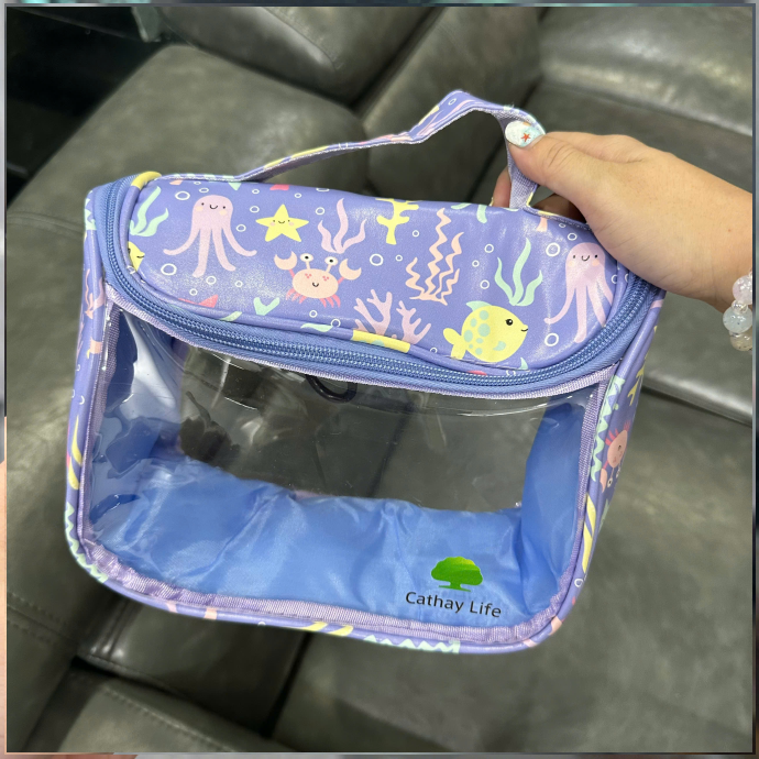 Túi đựng mỹ phẩm trong suốt in logo Cathay Life – thiết kế dễ thương, tiện lợi và phù hợp làm quà tặng sự kiện, hội nghị hoặc chương trình tri ân khách hàng.