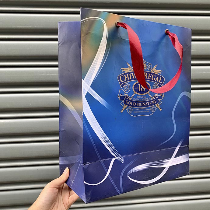 Túi giấy đựng rượu Chivas Regal 18 Gold Signature thiết kế màu xanh sang trọng, in ấn sắc nét, quai ruy băng đỏ nổi bật. Phù hợp làm bao bì quà tặng rượu cao cấp, sang trọng và đẳng cấp.