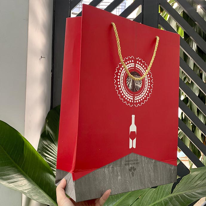 Túi giấy đựng rượu màu đỏ với thiết kế sang trọng, điểm nhấn là quai dây dù vàng và họa tiết in chai rượu tinh tế. Phần đáy in giả vân gỗ tạo sự khác biệt và đẳng cấp, giúp nâng cao giá trị món quà. Sản phẩm phù hợp để đựng rượu vang, whisky hoặc champagne trong các dịp lễ, Tết, hội nghị và sự kiện đặc biệt.